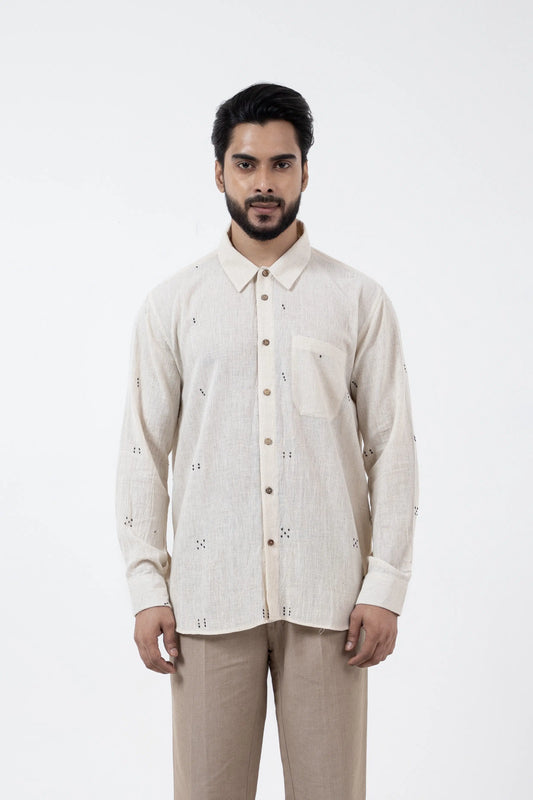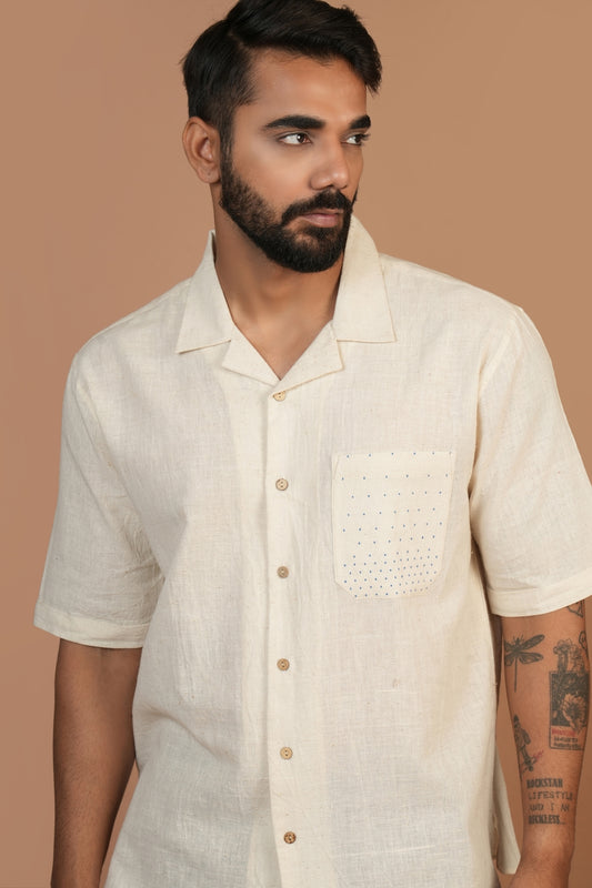 Handloom Off-white Shirt with Blue Tangaliya Dots Pocket