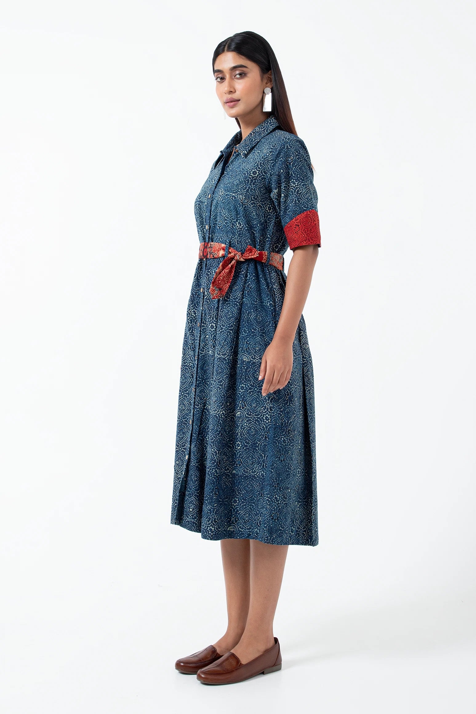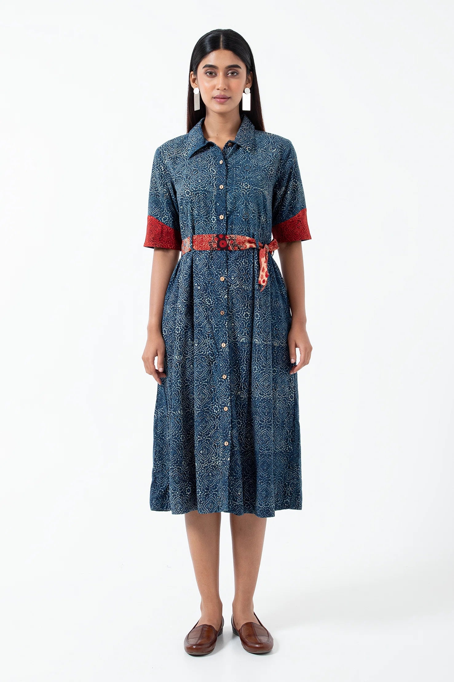 Key Feature: This is a button-down midi-length shirt dress with a classic collar and half sleeves enhanced by contrast fabric blocking for a modern twist. Features box pleats and a fabric belt for adding structure and a tailored look.