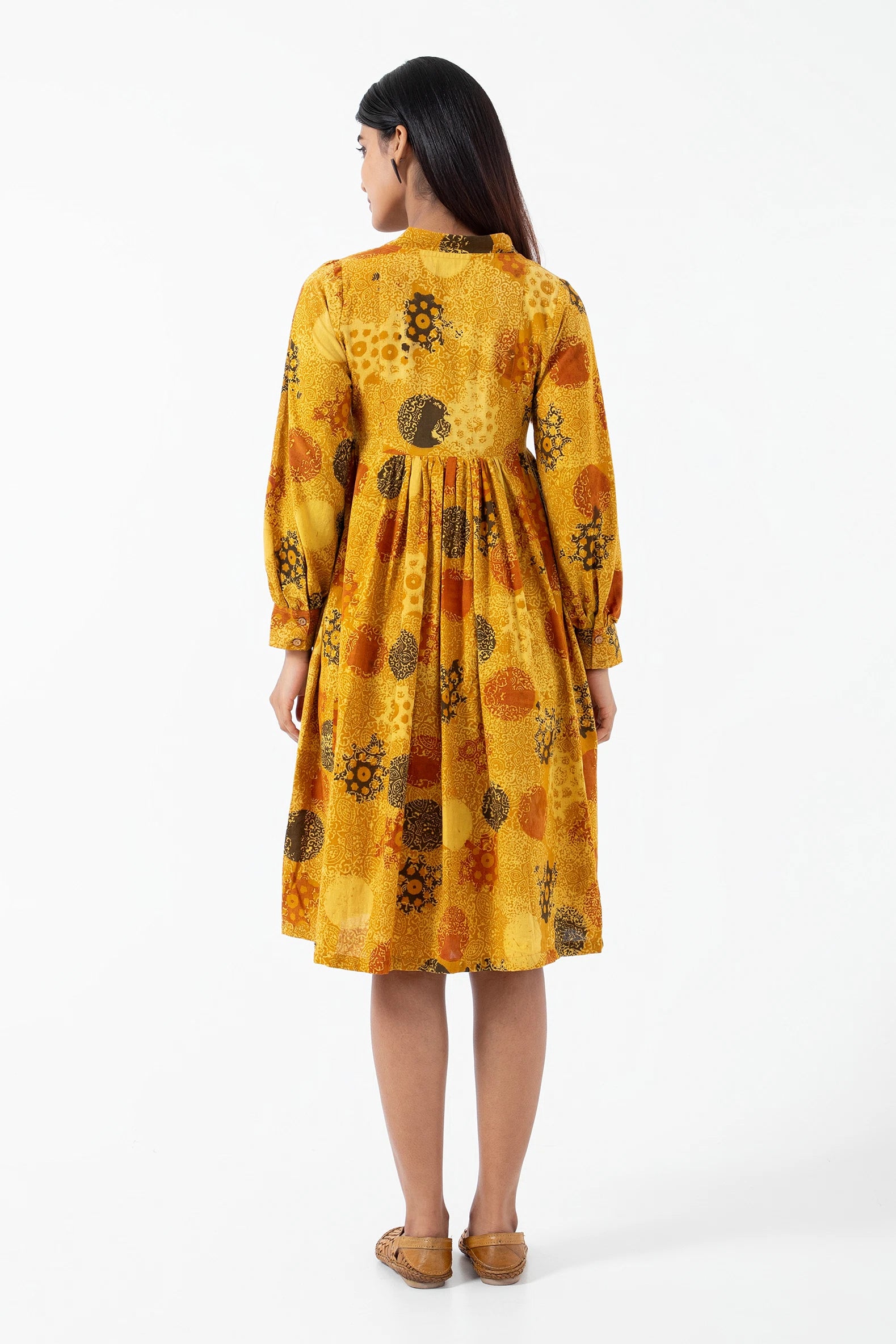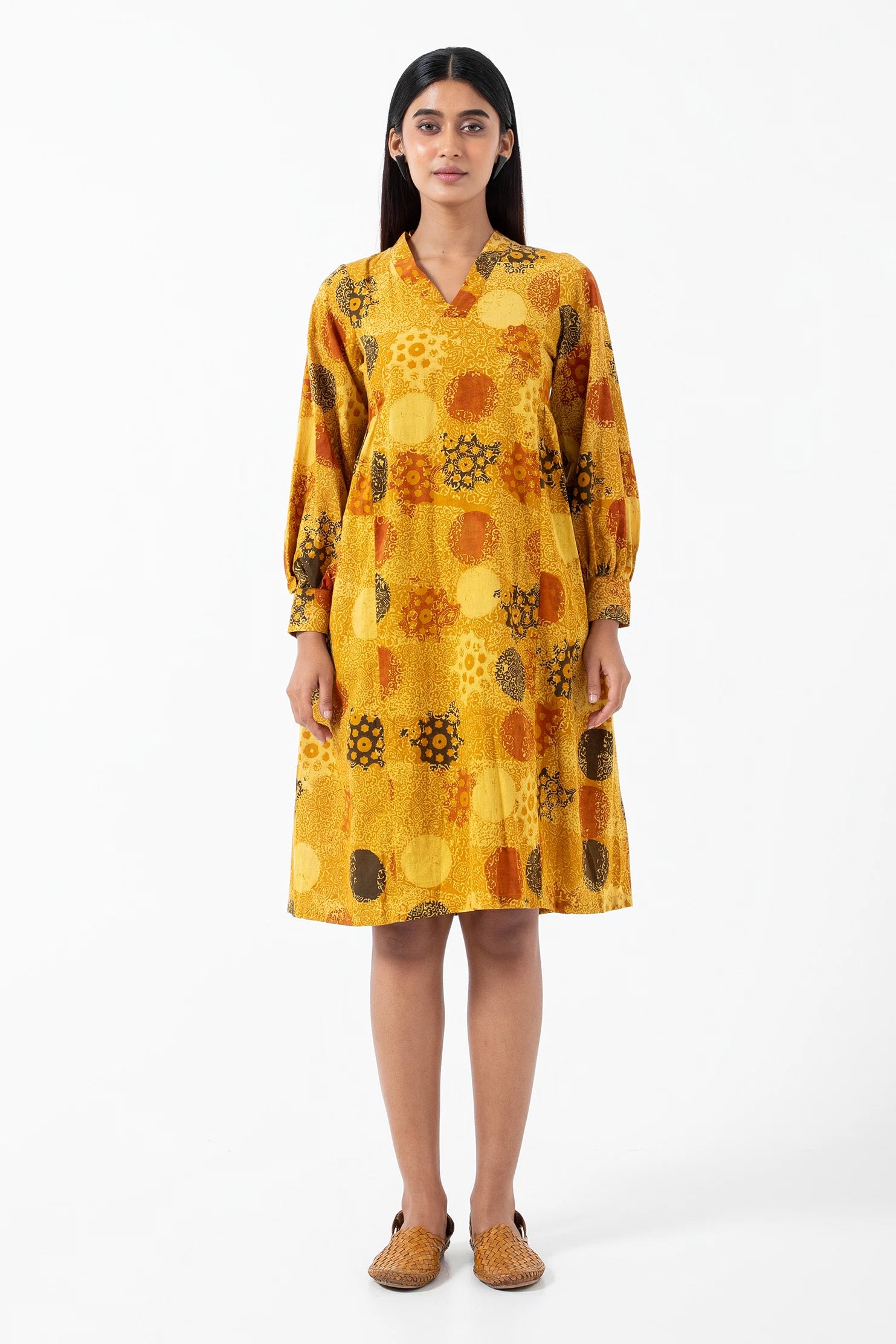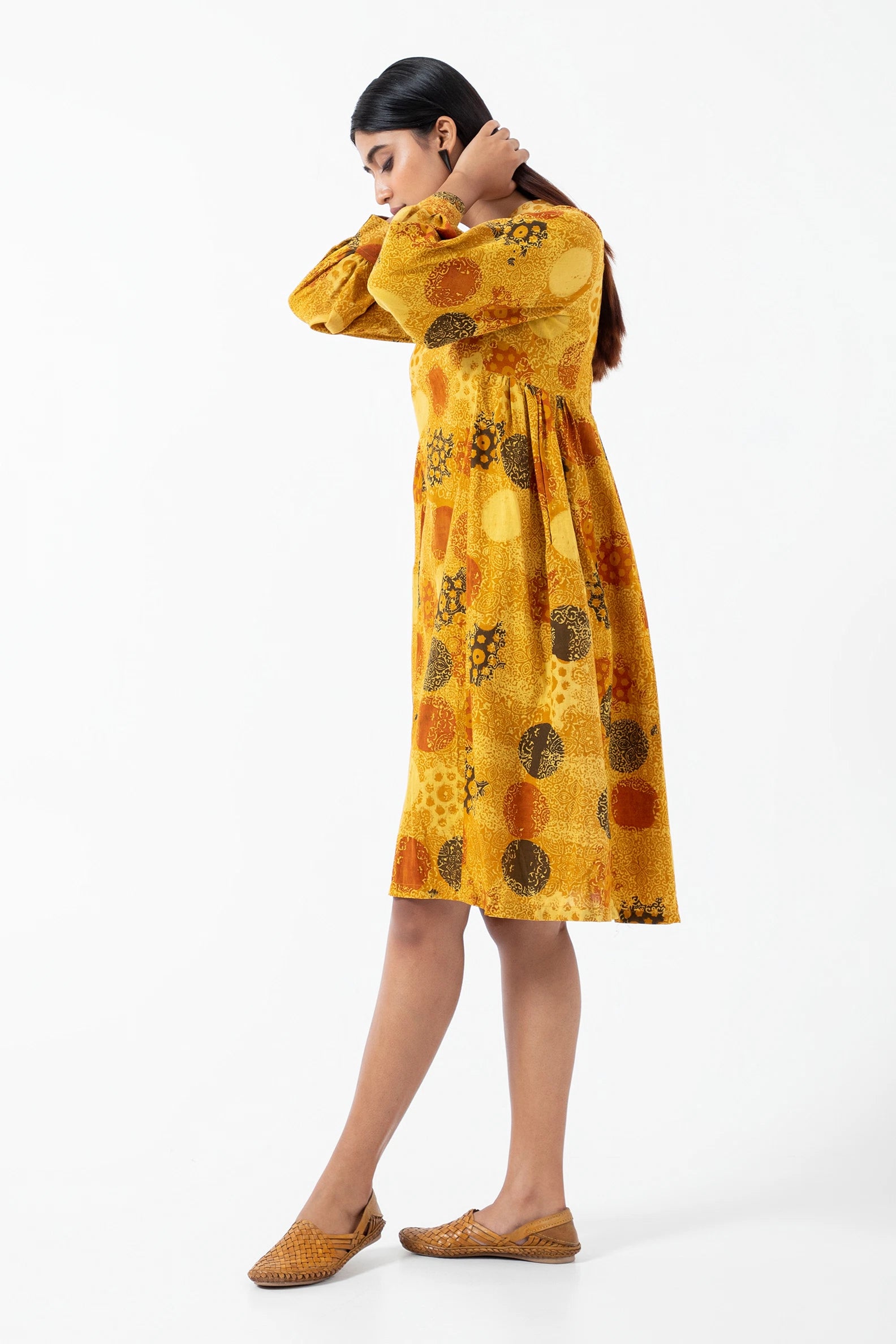 Key Feature: A timeless dress designed with side gathers and a mix of fabrics and cuts to suit all body types. It features dramatic bishop sleeves for added flair and convenient pockets for functionality.