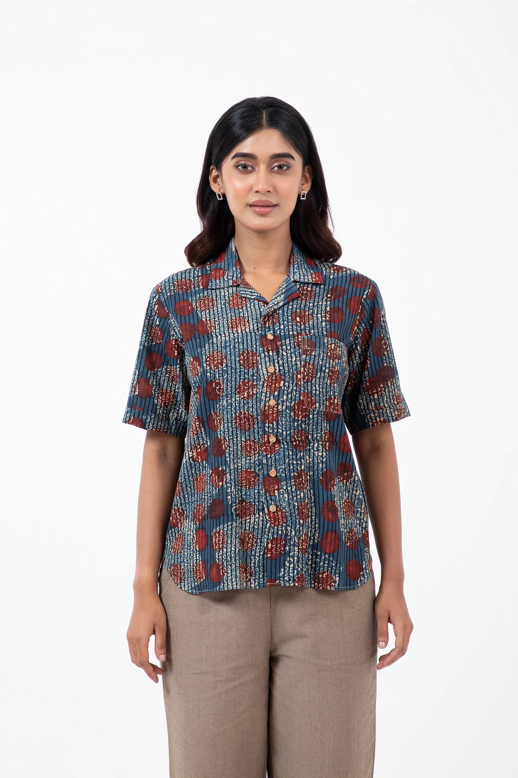 Key Feature: A classic oversized camp collar shirt with relaxed half-sleeves and a patch pocket.