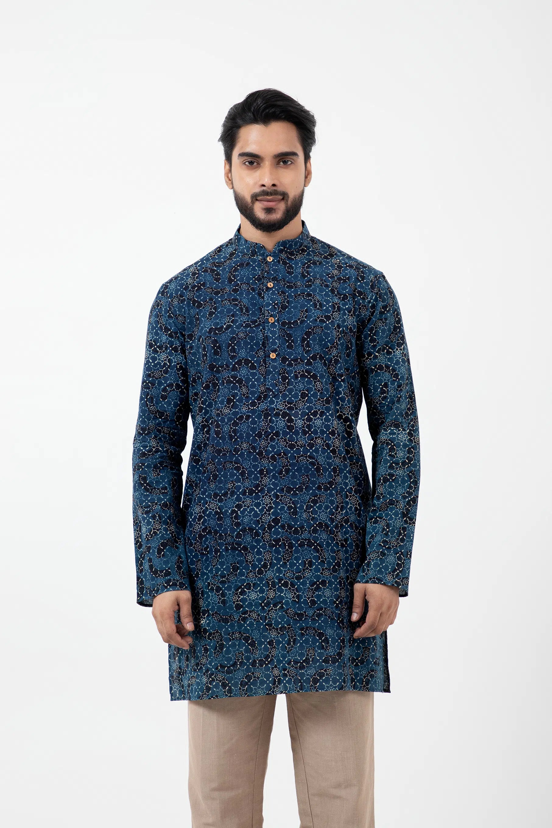 Key Feature: This is a short sleek full-sleeve Mandarin kurta, combining timeles and traditional style with side pockets.