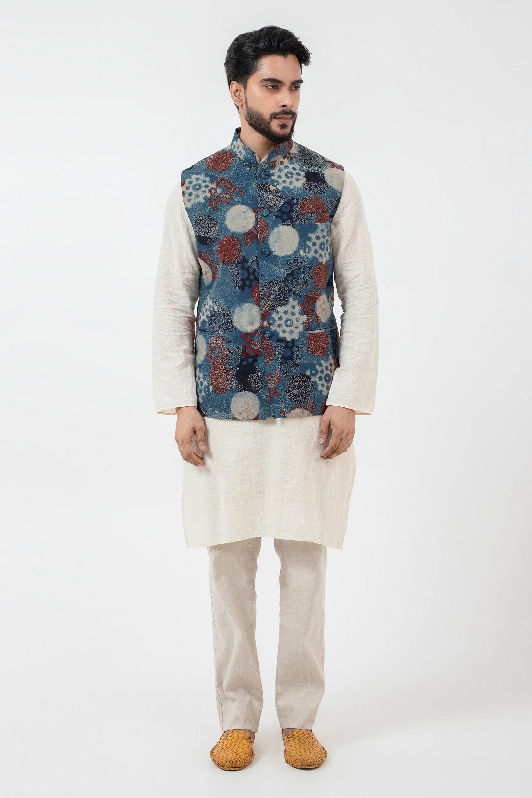 Key Feature: Classic Bandi, also known as the Nehru Jacket or Modi jacket, featuring cloth buttons and side slits for a timeless and sophisticated look.