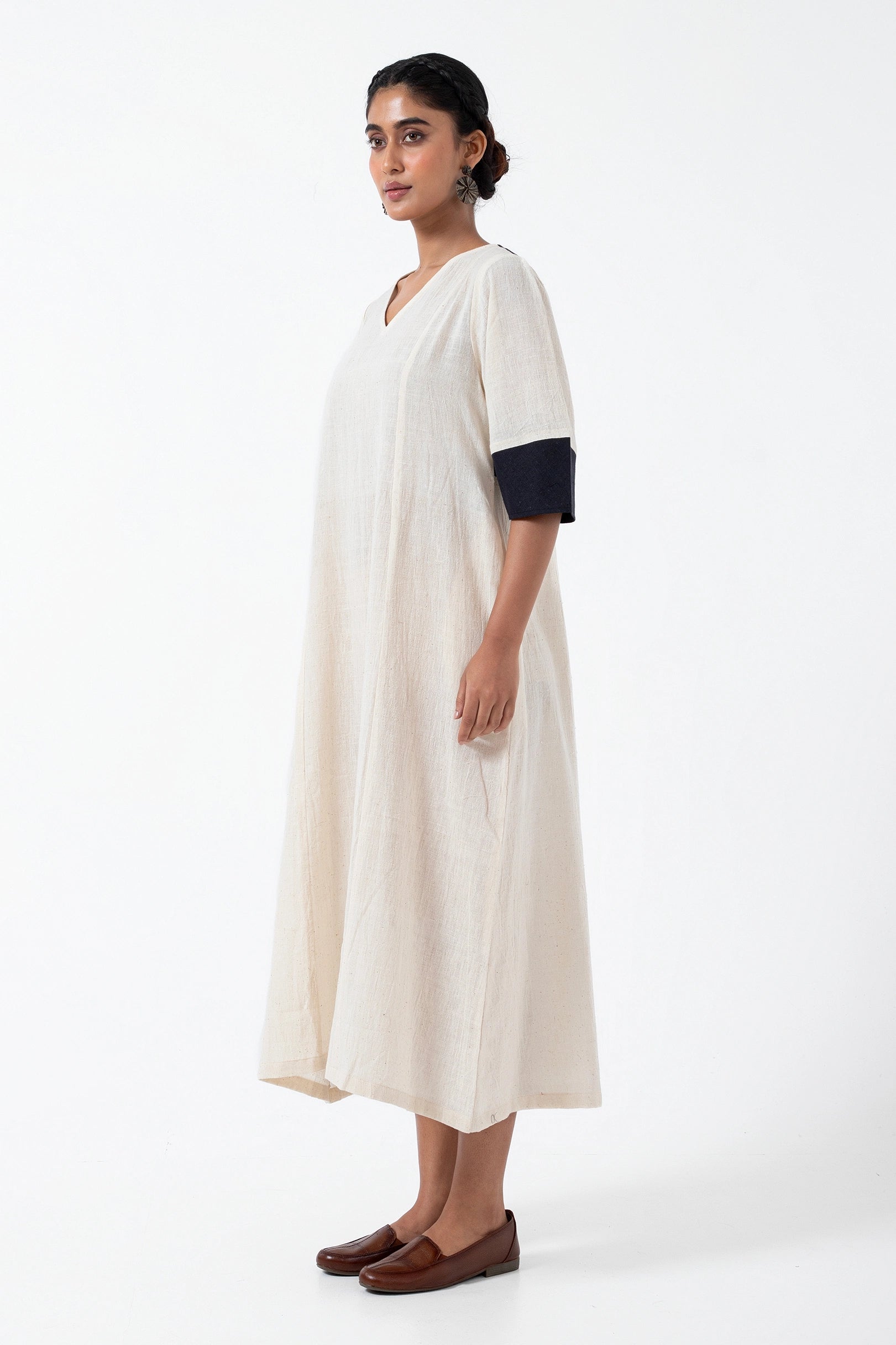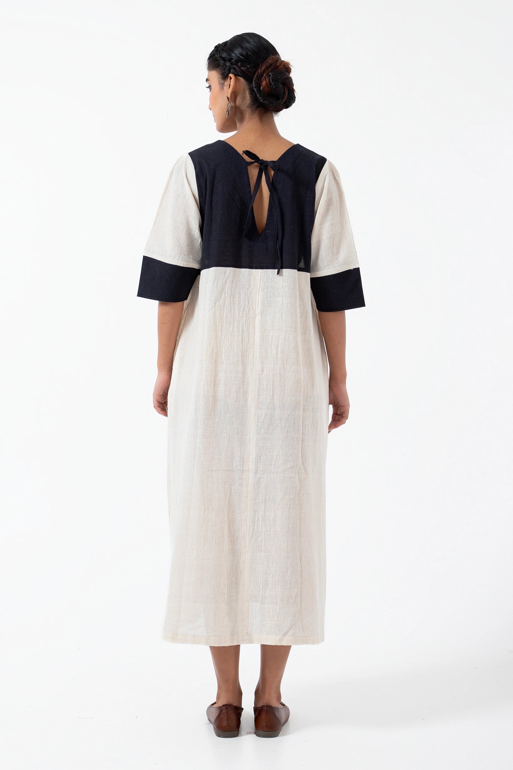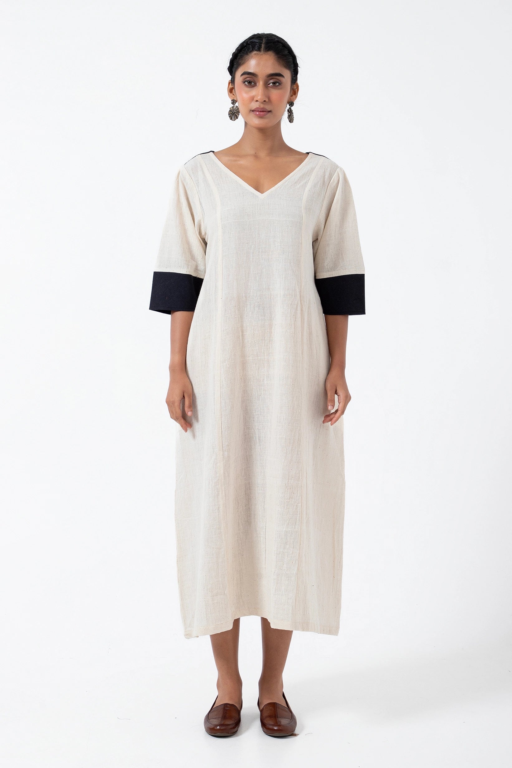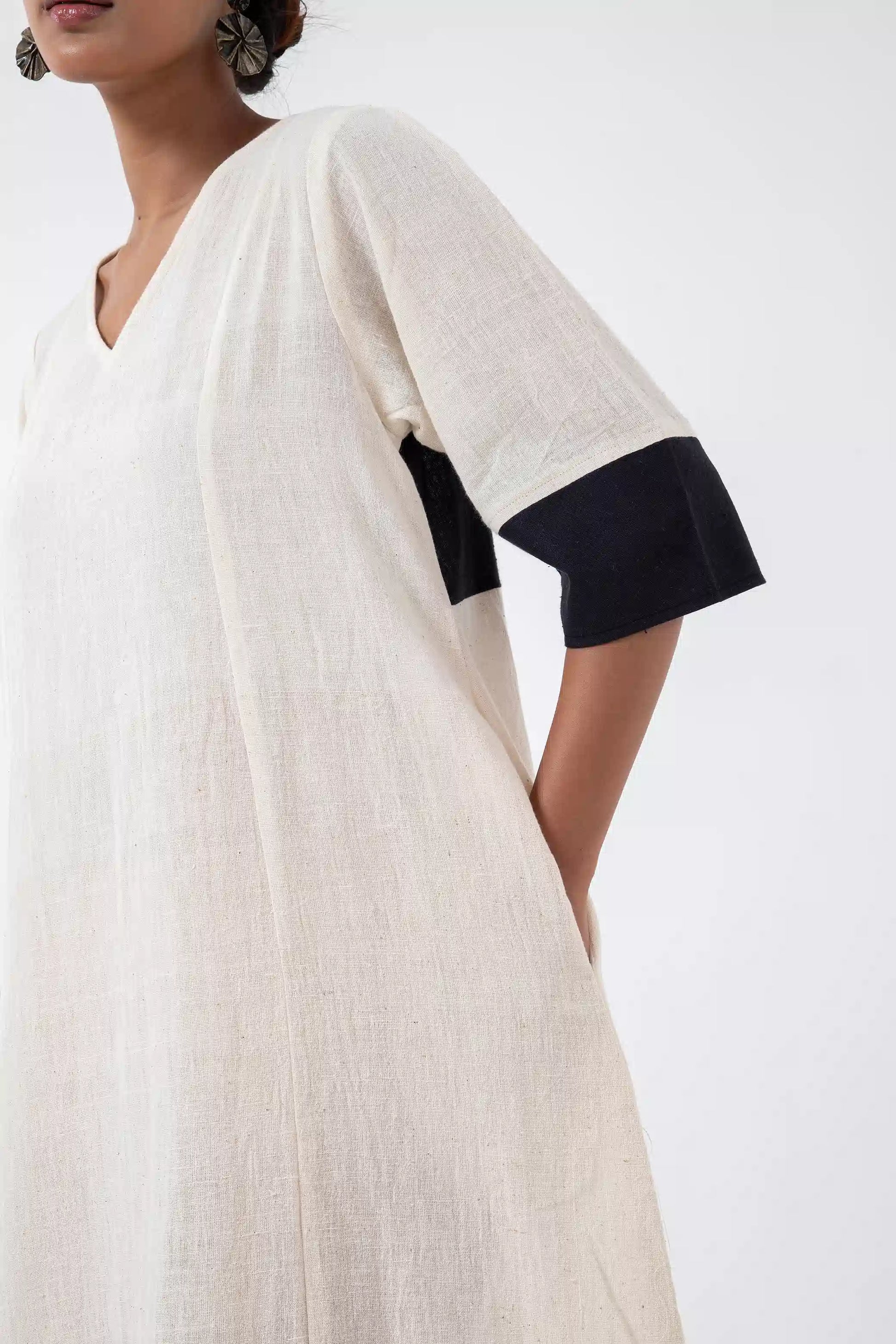 Key Feature: This is a long, relaxed fit midi-dress. It features a unique sleeve design and a flattering V-neckline, complemented by an interesting back opening for added flair and elegance.