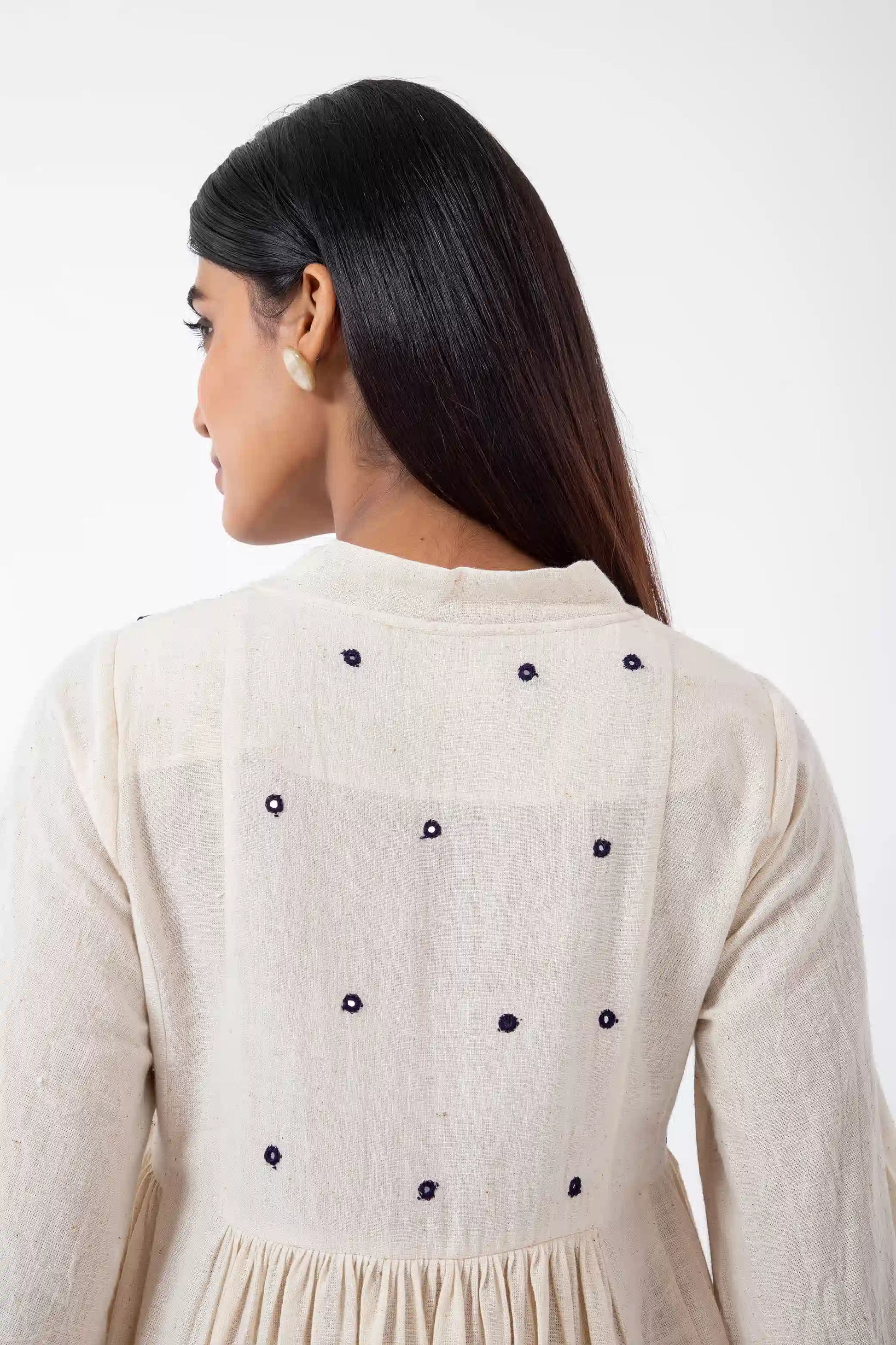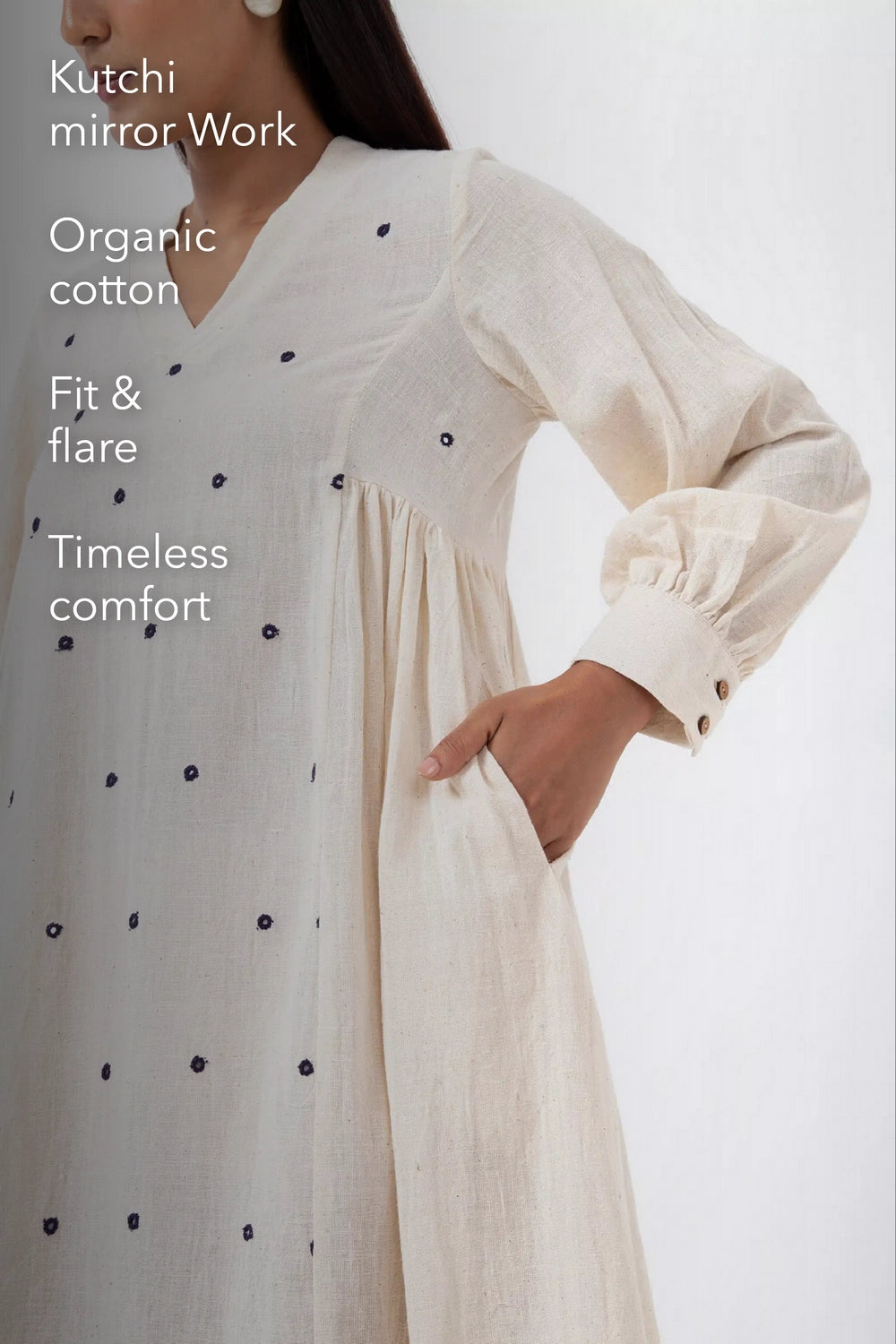 - The mirror work is hand-embroidered by local women artisans in Kutch.
