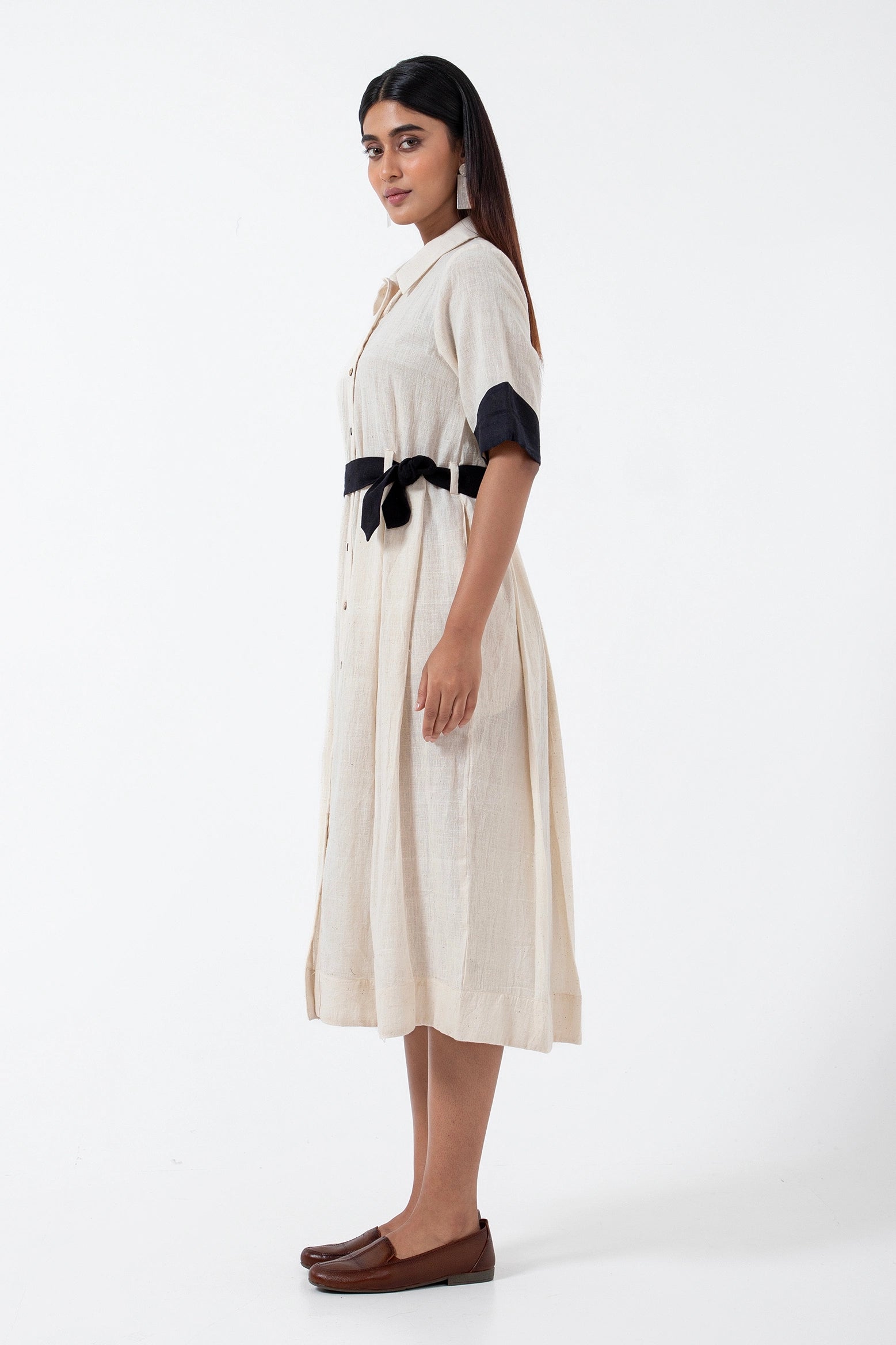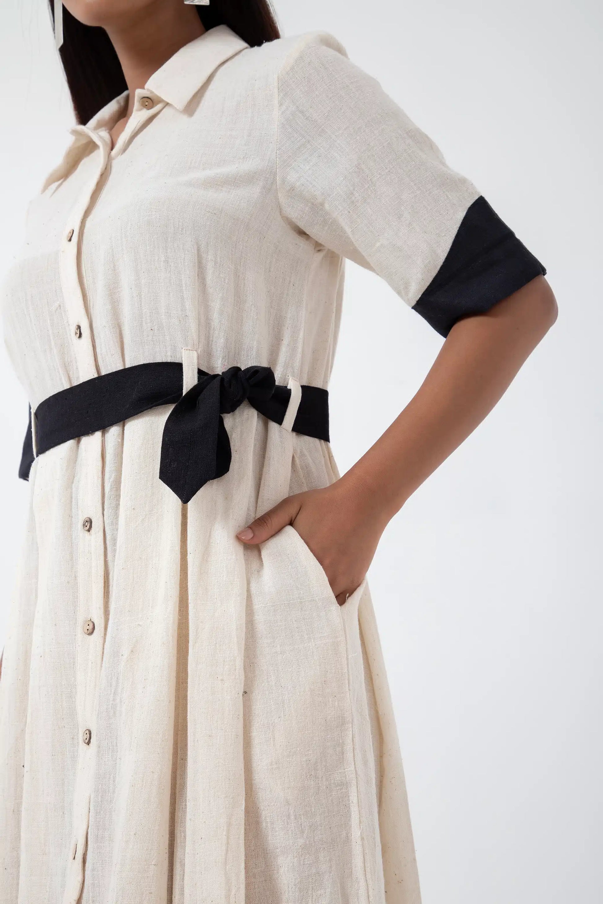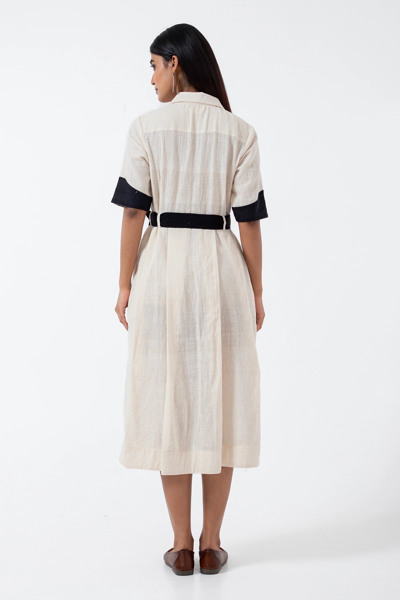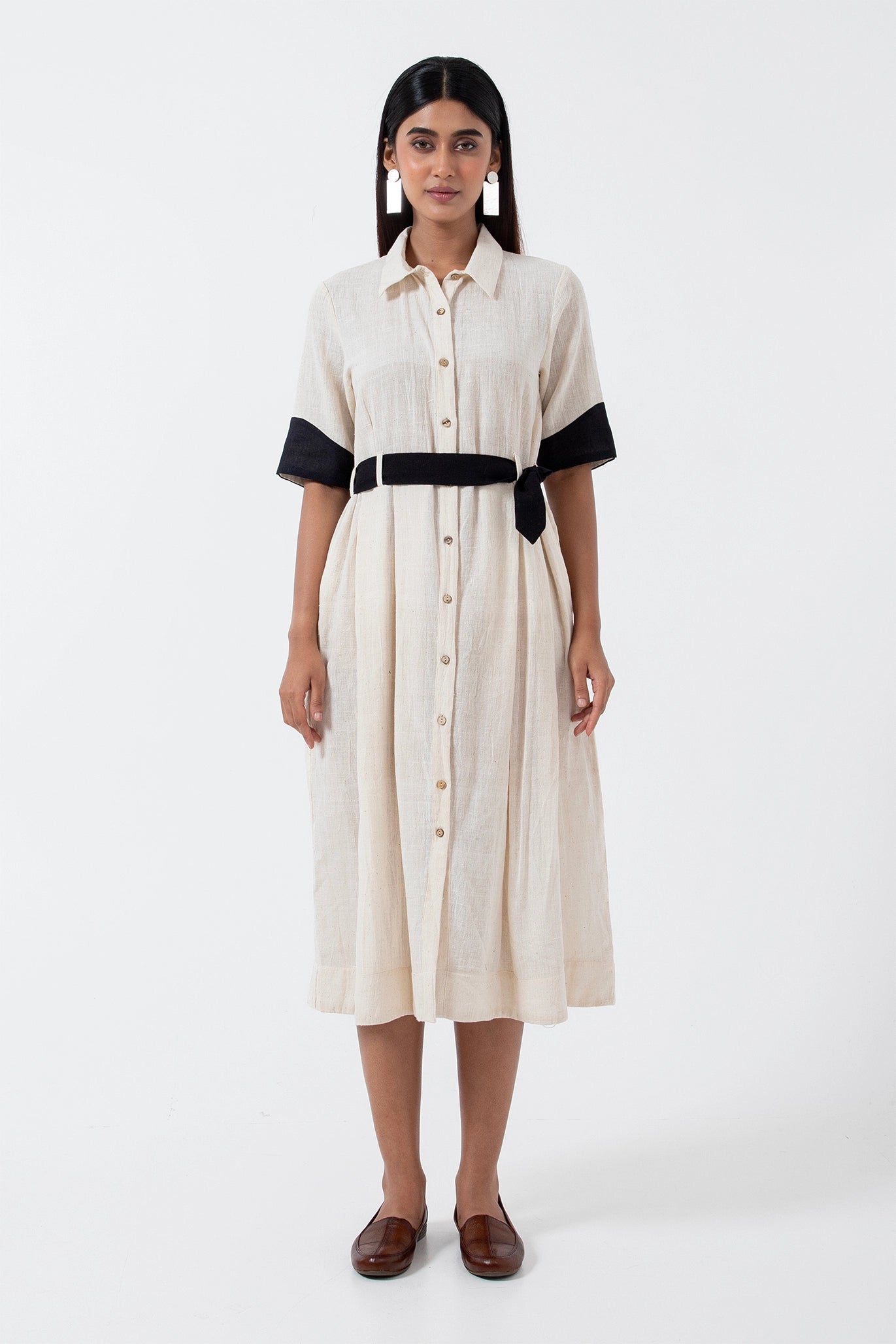 Key Feature: This is a button-down midi-length shirt dress with a classic collar and half sleeves enhanced by contrast fabric blocking for a modern twist. Features box pleats and a fabric belt for adding structure and tailored look.