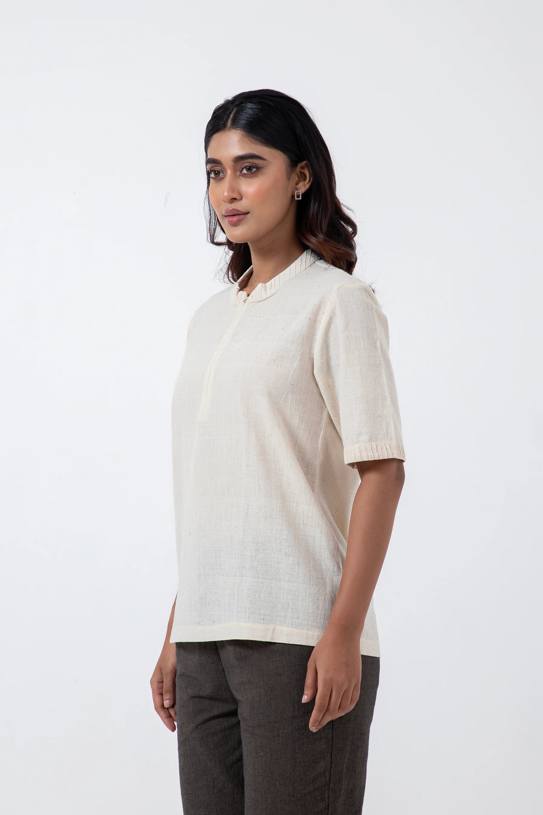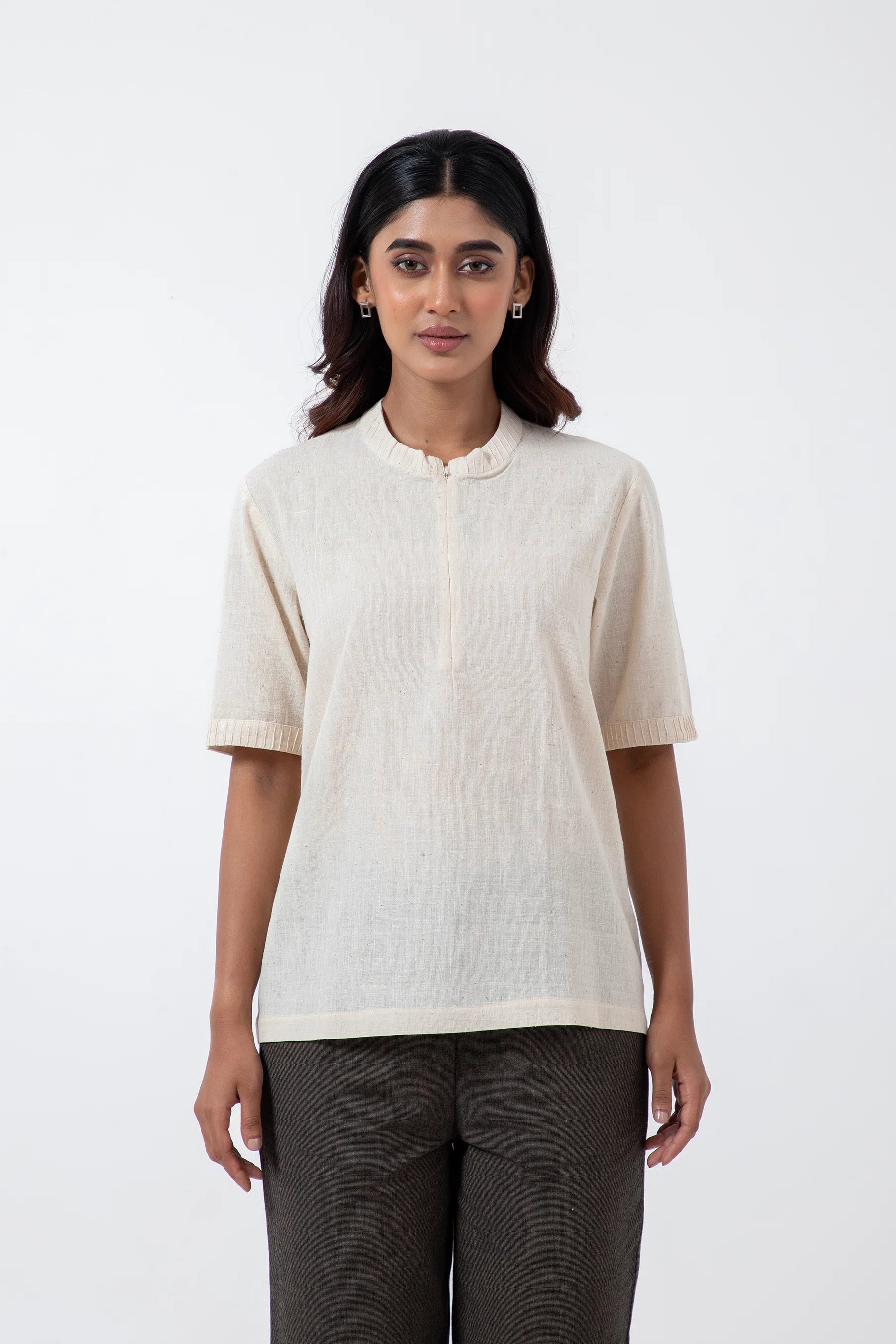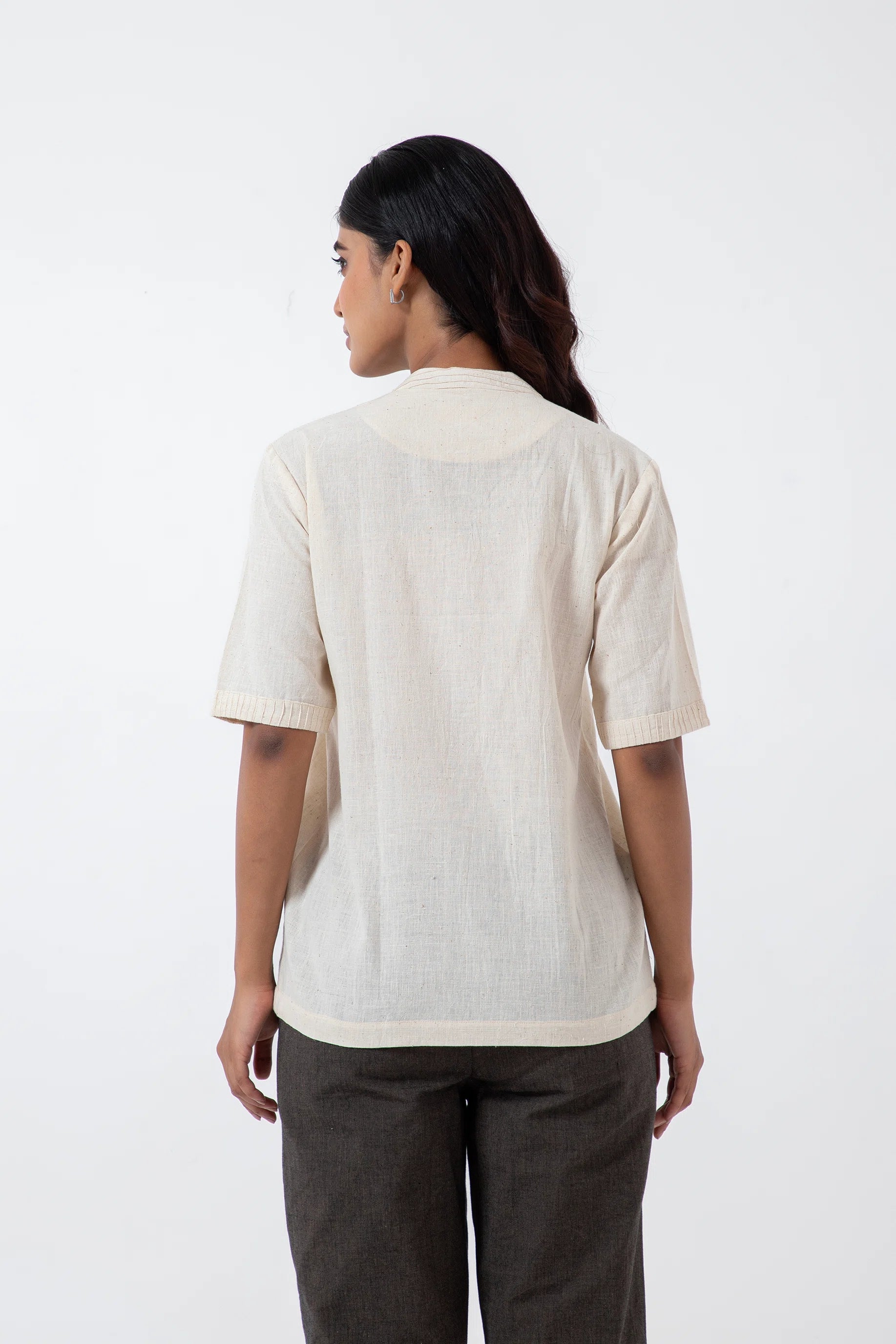 Key Feature: Handwoven boxy t-shirt, featuring pintuck details on the neck and sleeve edges for a ribbed effect.