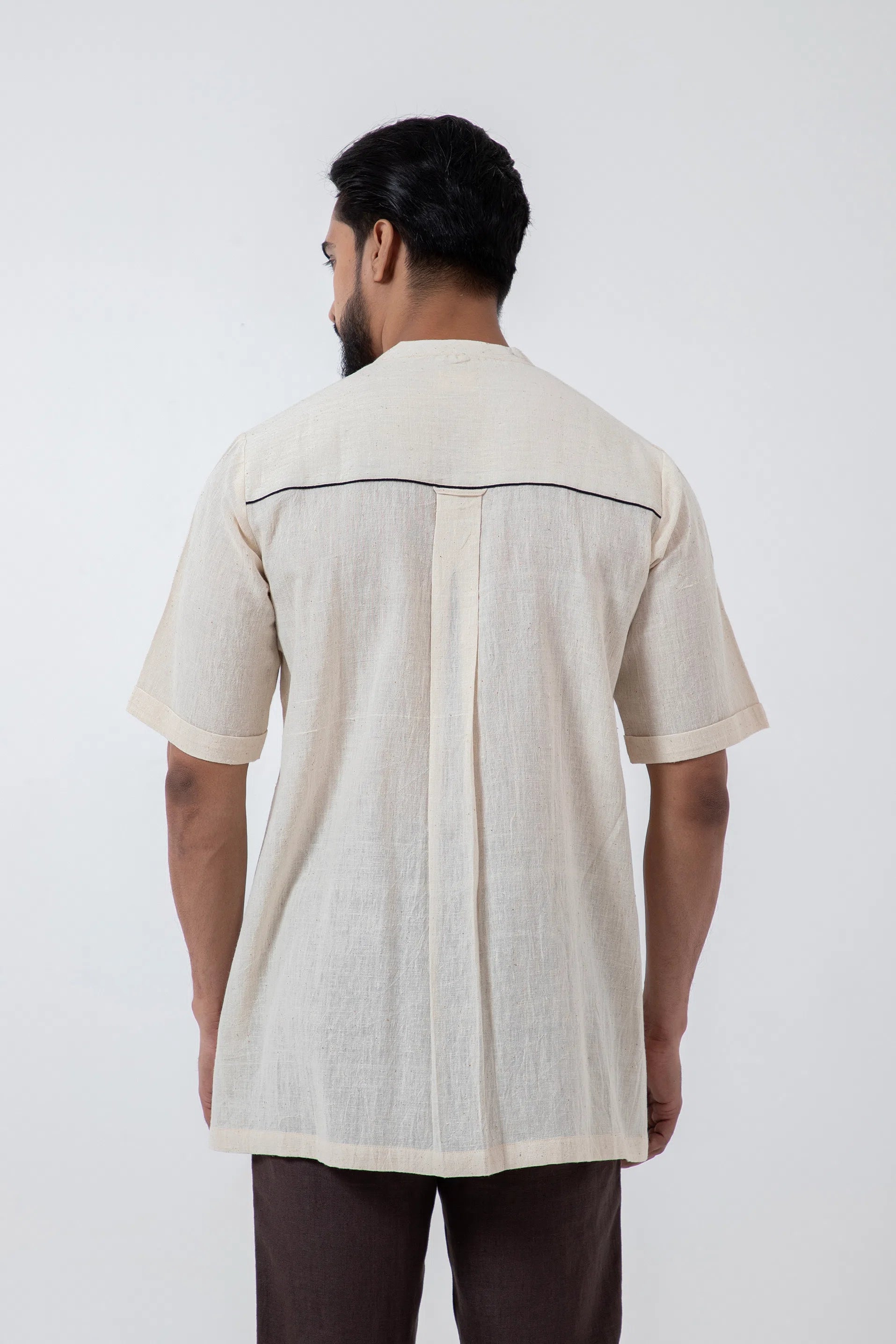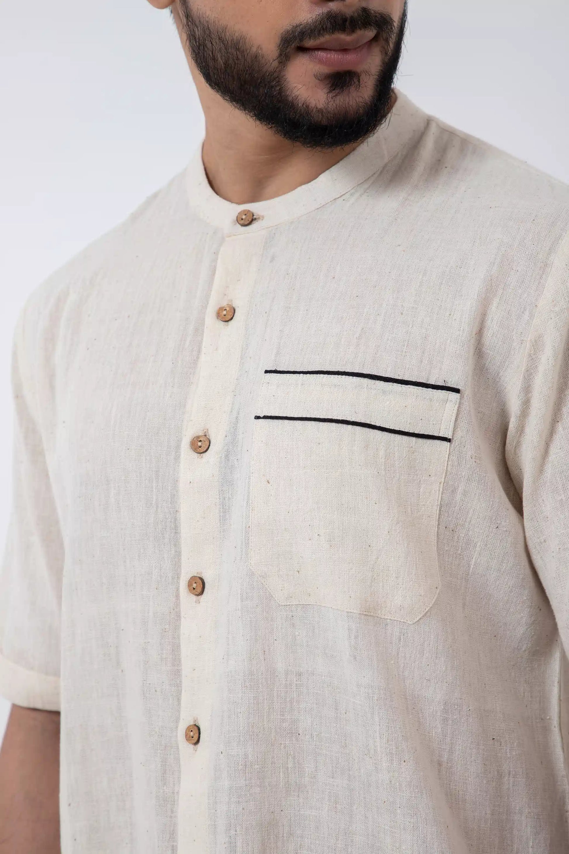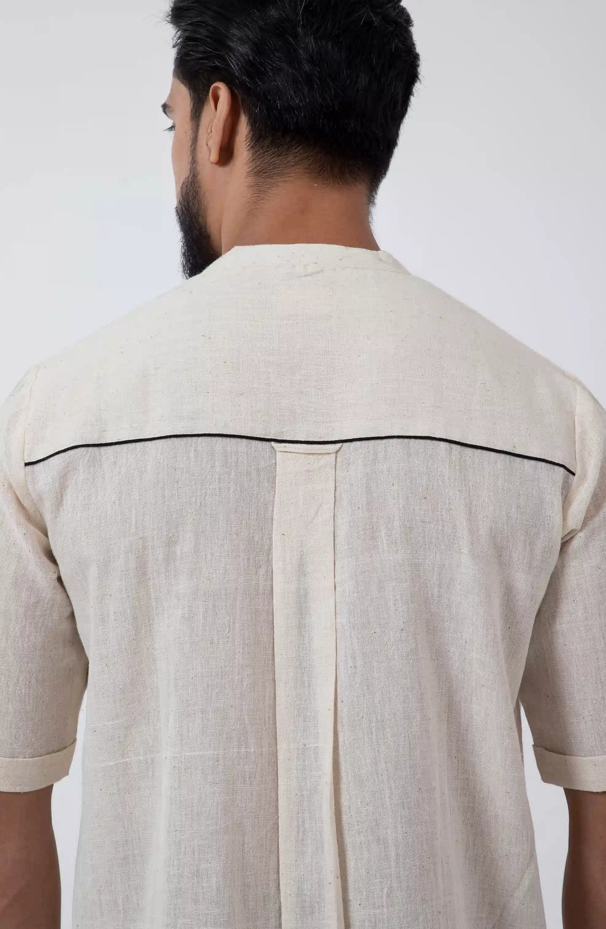 Key Feature: Classic men's shirt with a mandarin collar, half-sleeves, and black piping detailing on the pocket and back yoke. Features a box pleat at the back for added ease of movement.