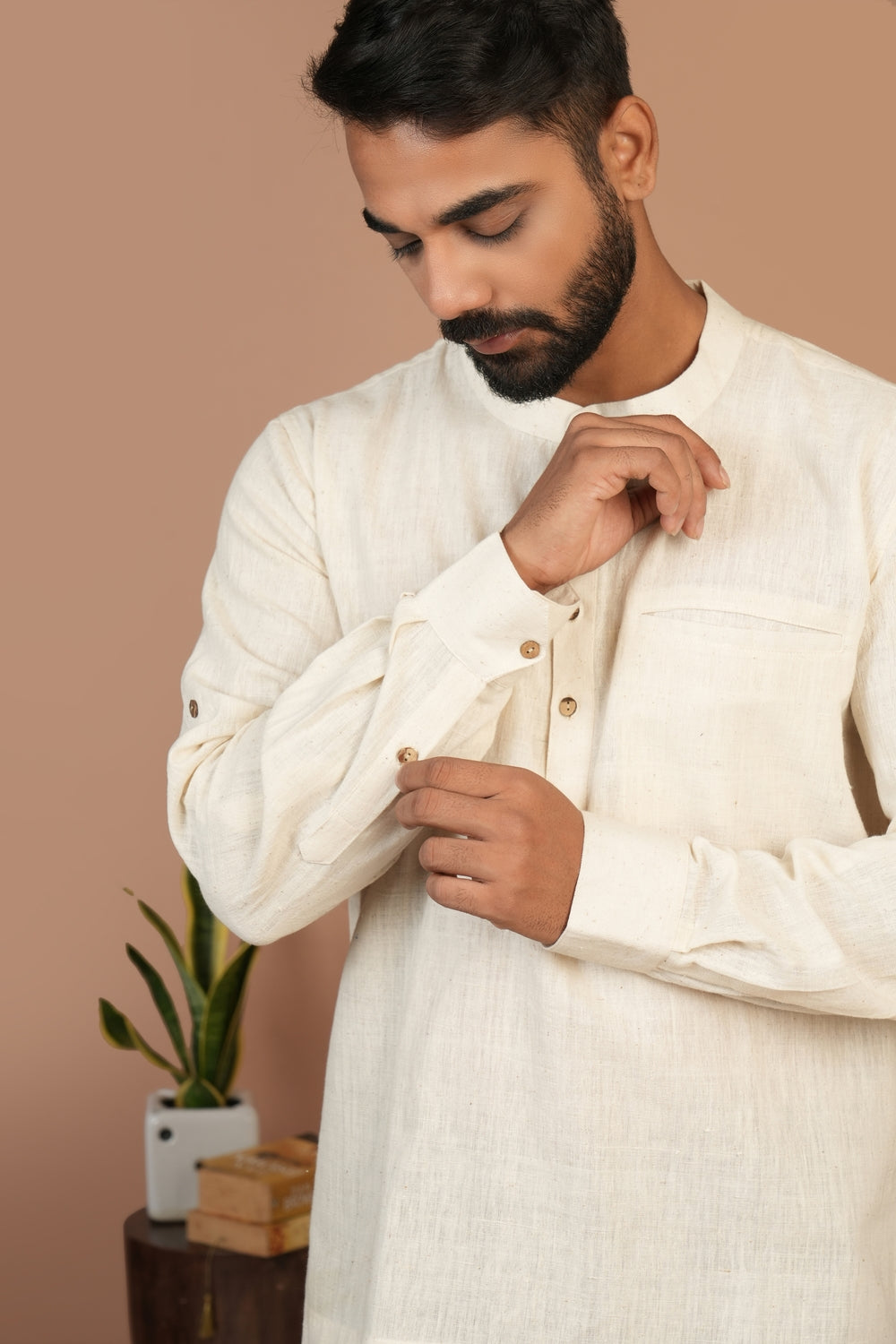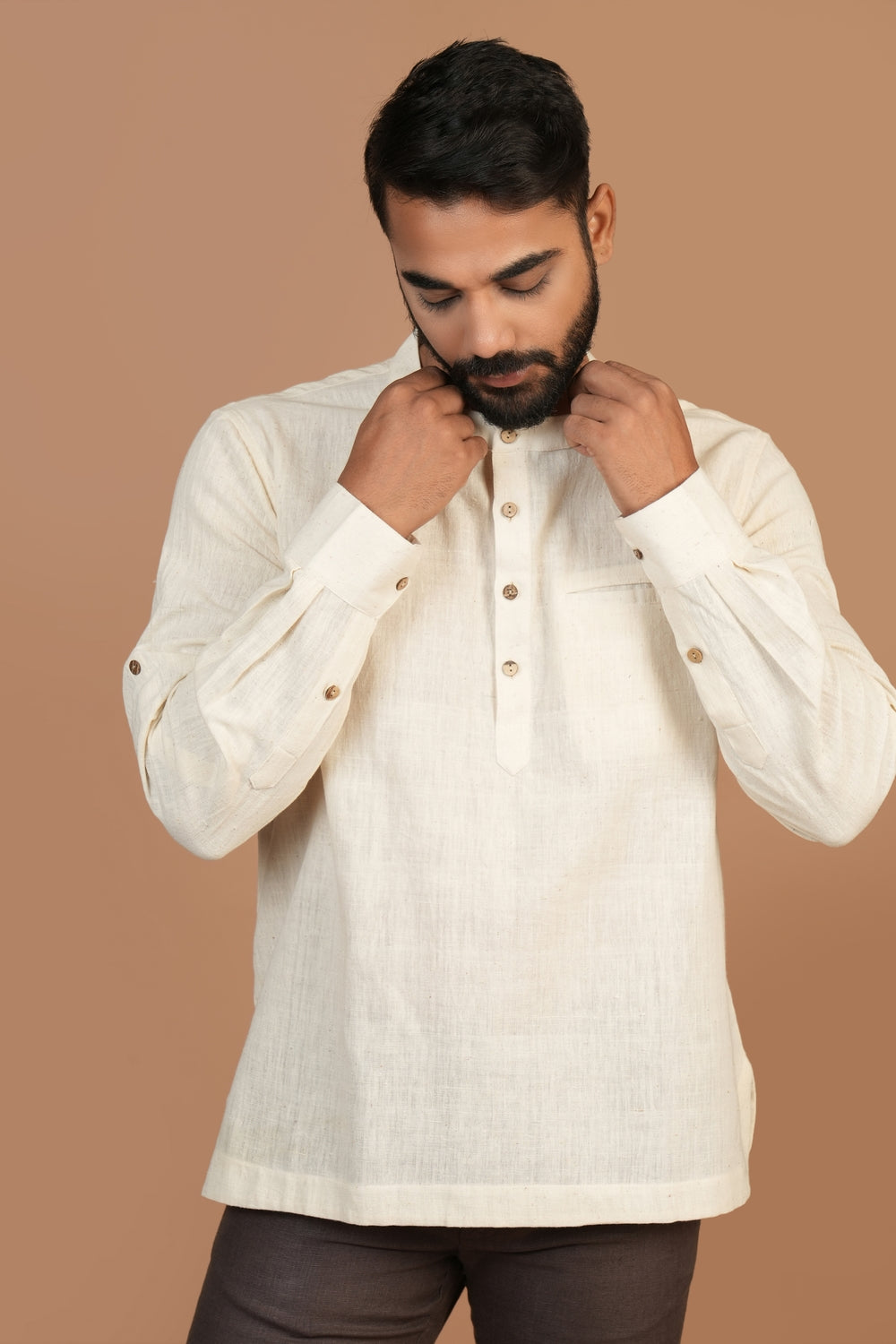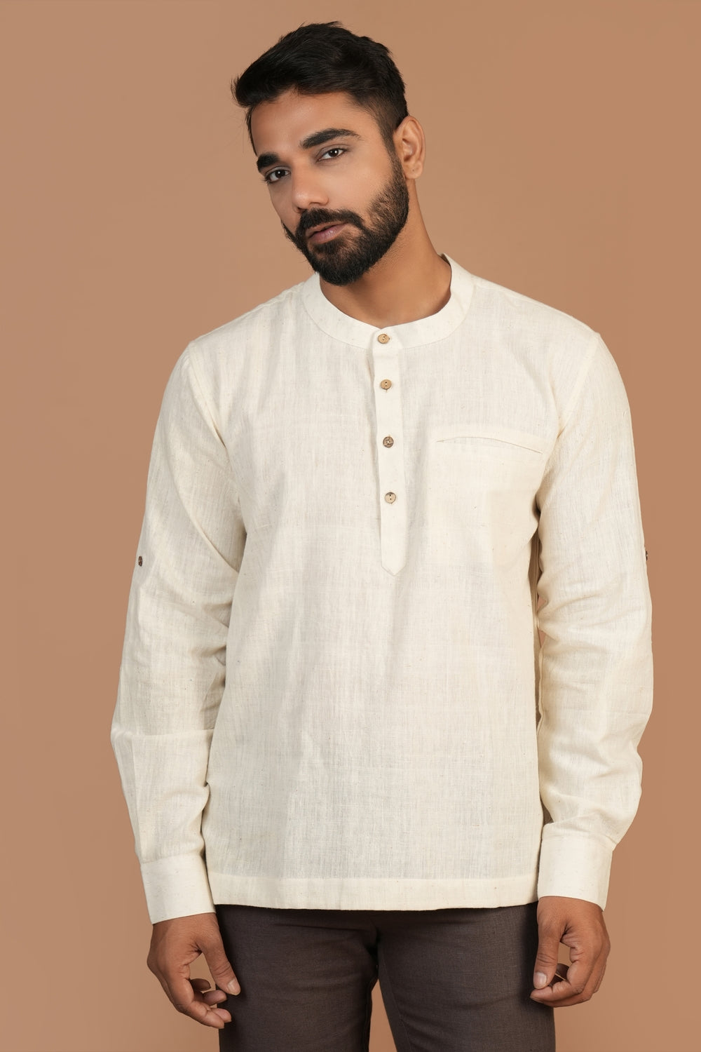 Key Feature: Classic men's kurta shirt with a mandarin collar, t-shirt placket, and long foldable sleeve.