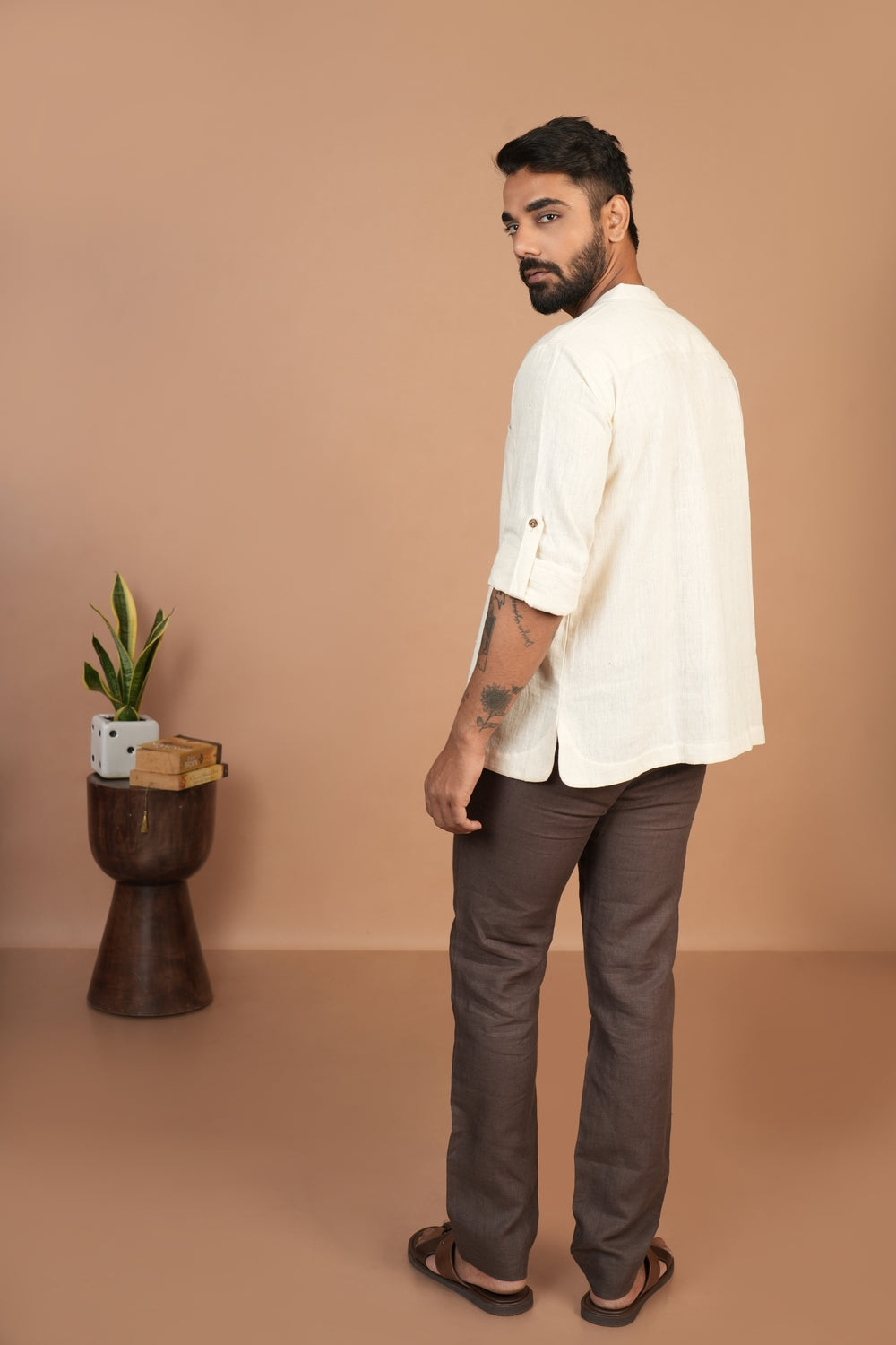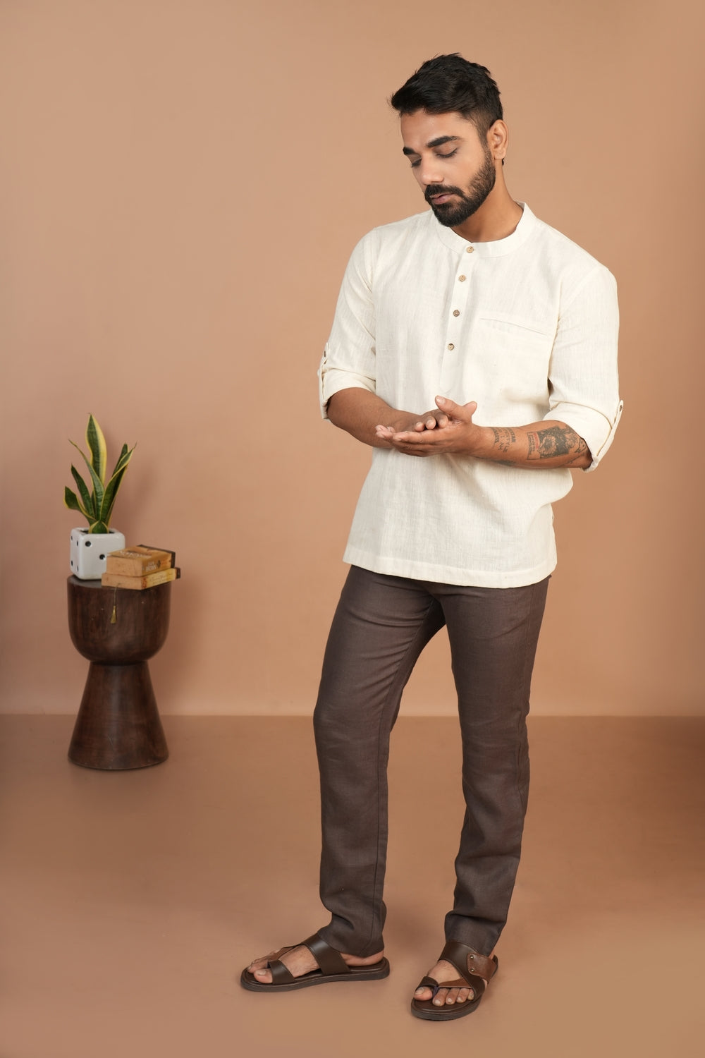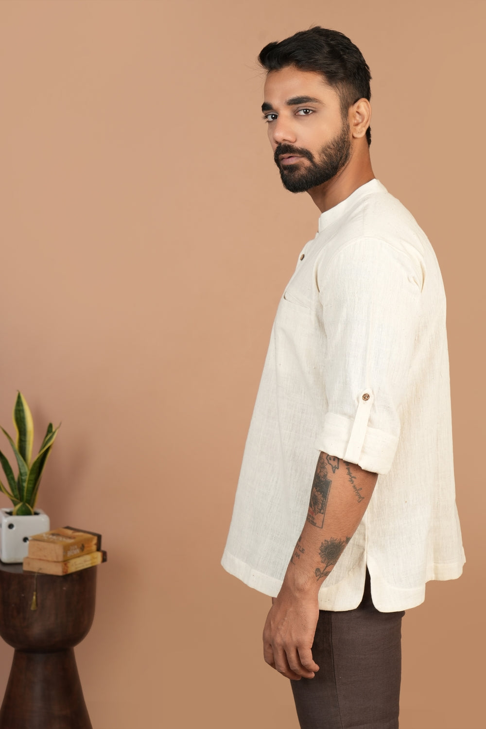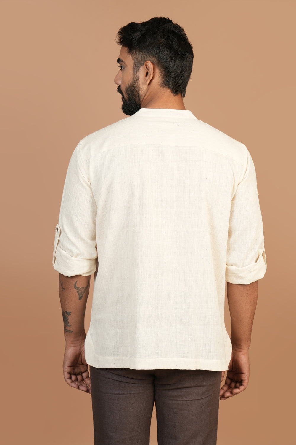Key Feature: Classic men's kurta shirt with a mandarin collar, t-shirt placket, and long foldable sleeve.