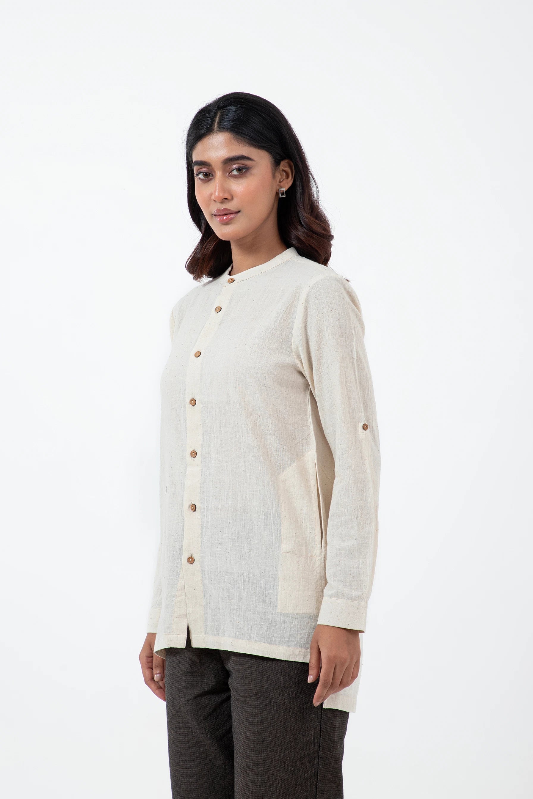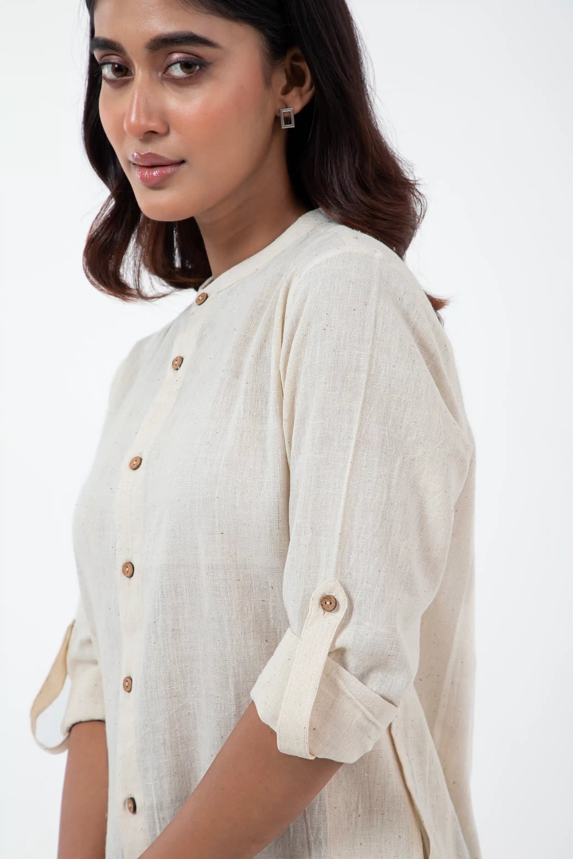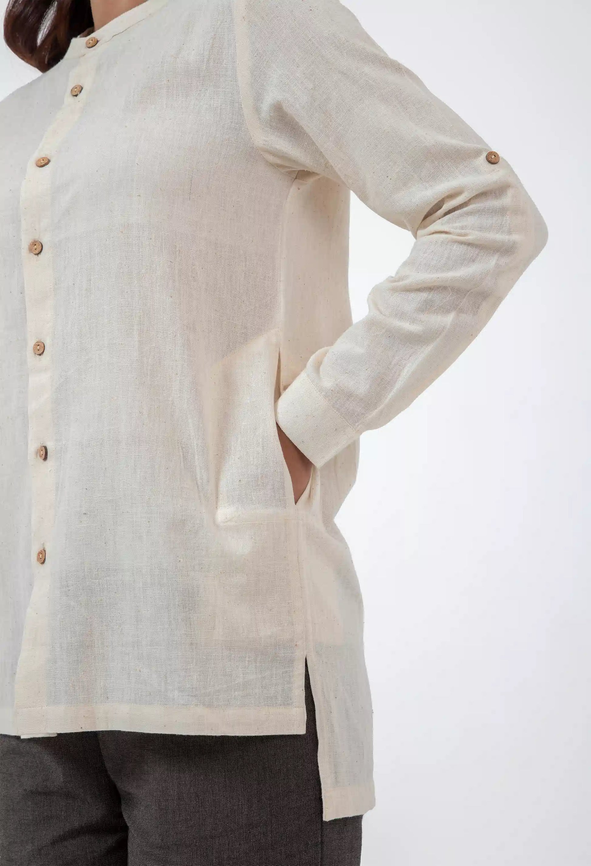 Key Feature: Kurta shirt with a high-low hem and side pockets. It features a foldable sleeve with a button and strap on the bicep for versatile styling.