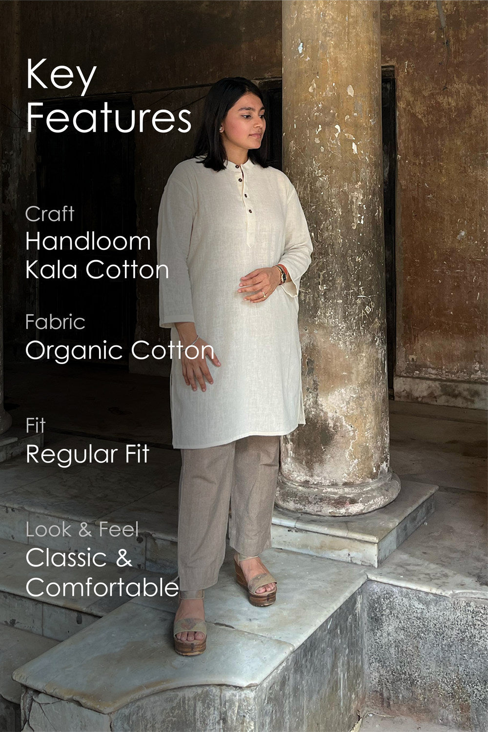 Key Feature: A timeless silhouette reimagined in an easy A-line fit, this kurta features a classic round neckline with button detailing till the chest. Designed with 3/4th sleeves and thoughtfully placed side pockets, it's both elegant and functional — perfect for days when comfort and style need to go hand in hand.