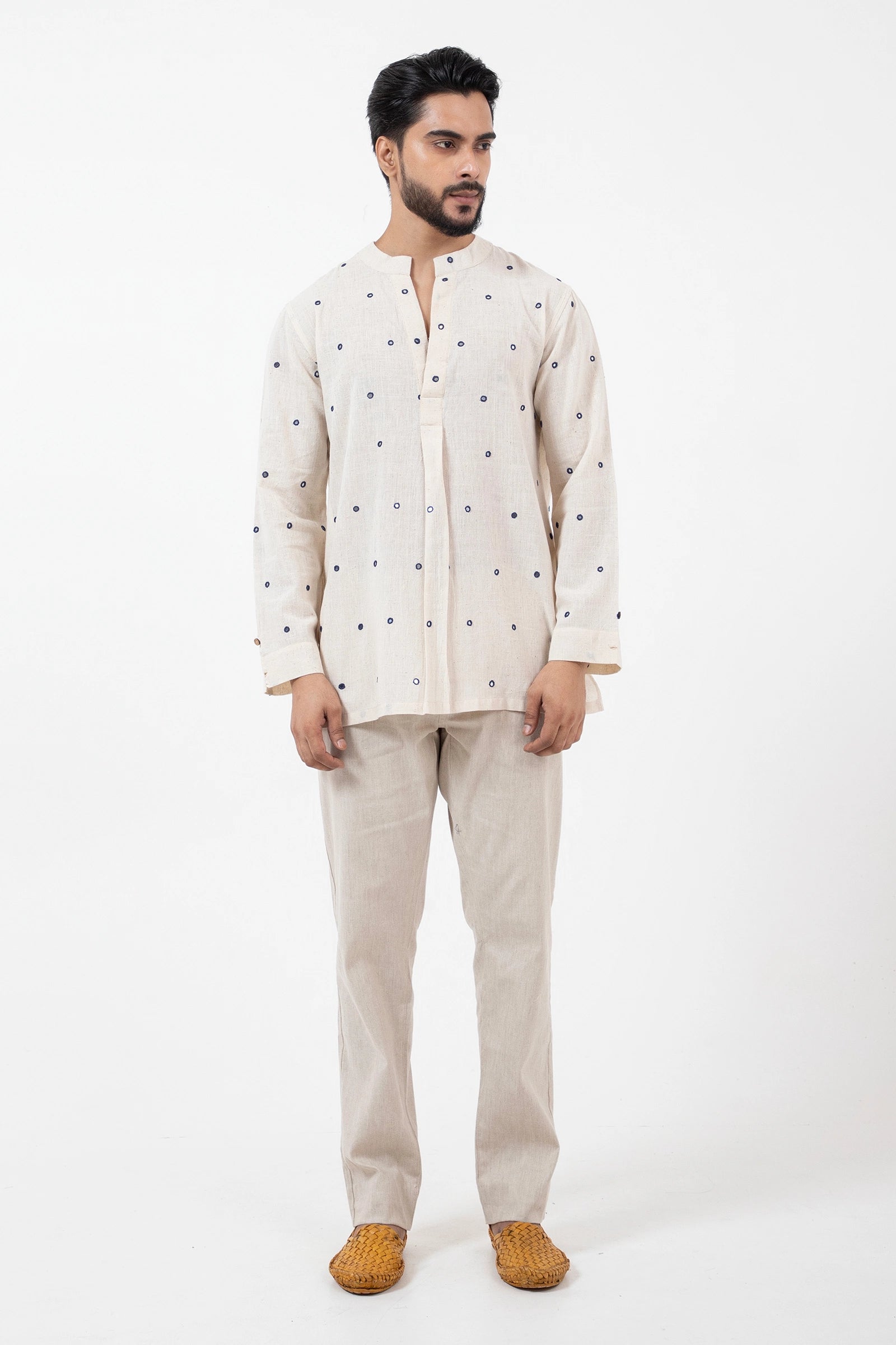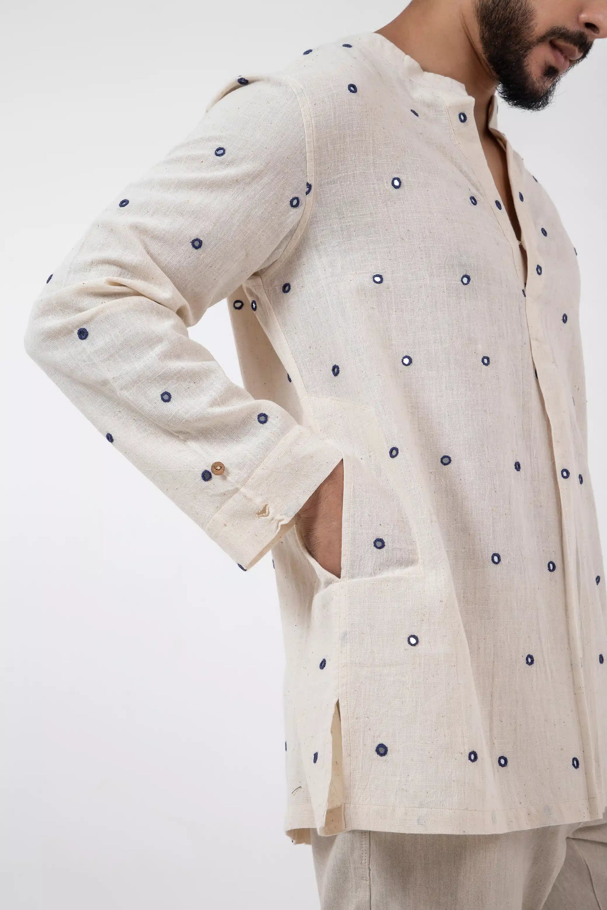 Key Feature: Unisex short kurta with side pockets and reversible 2" cuffs.