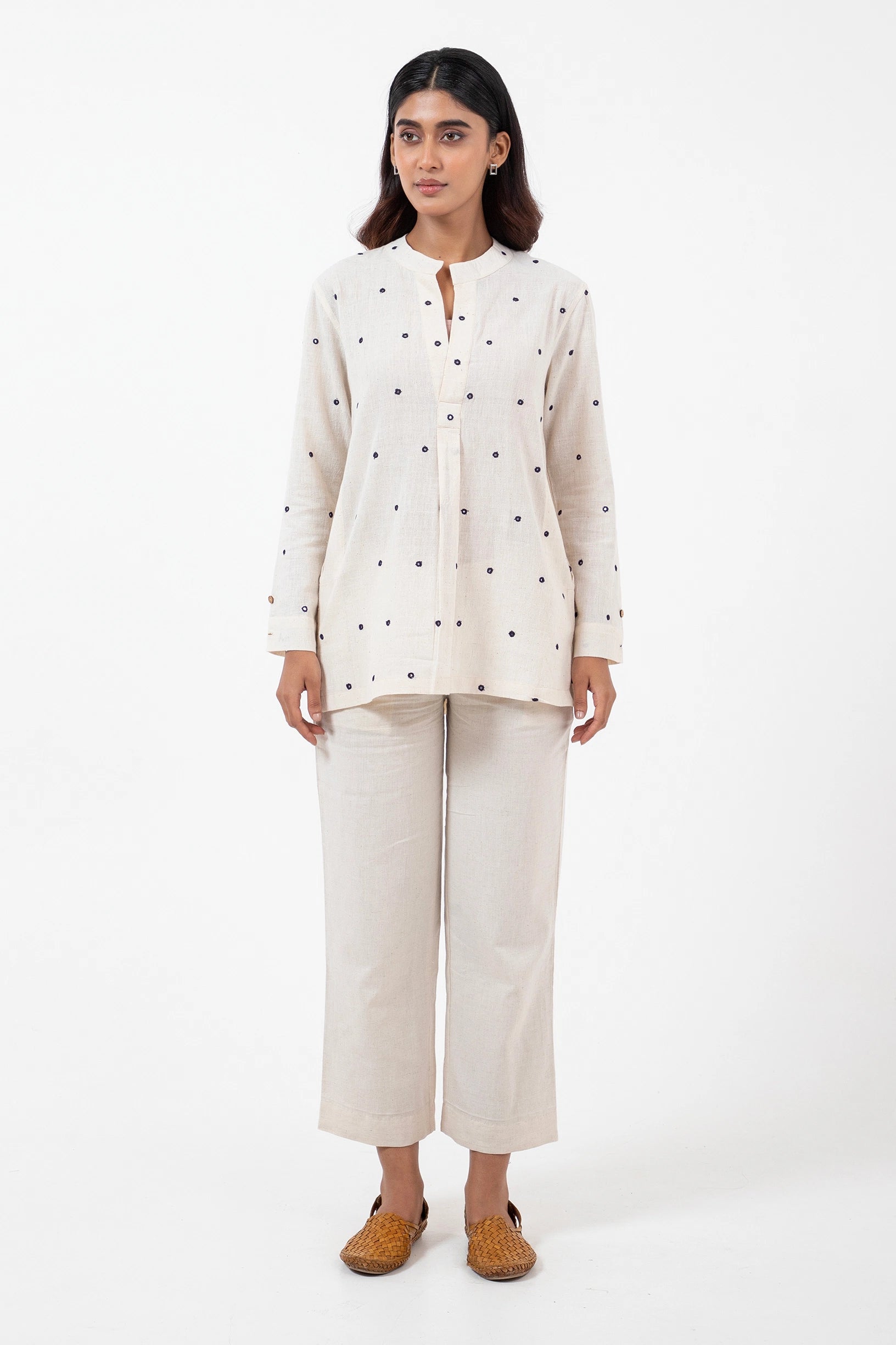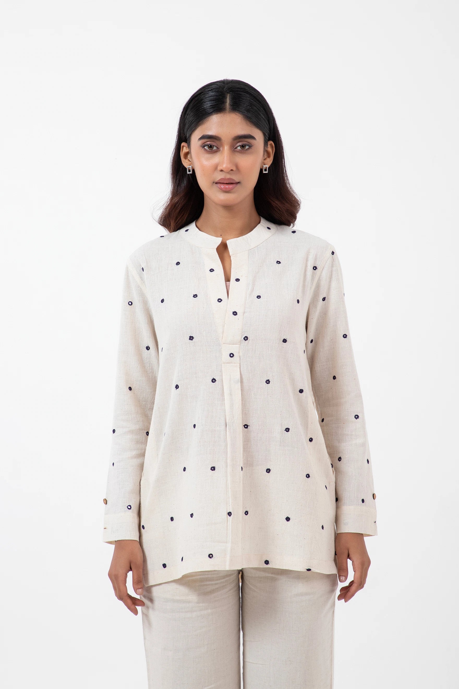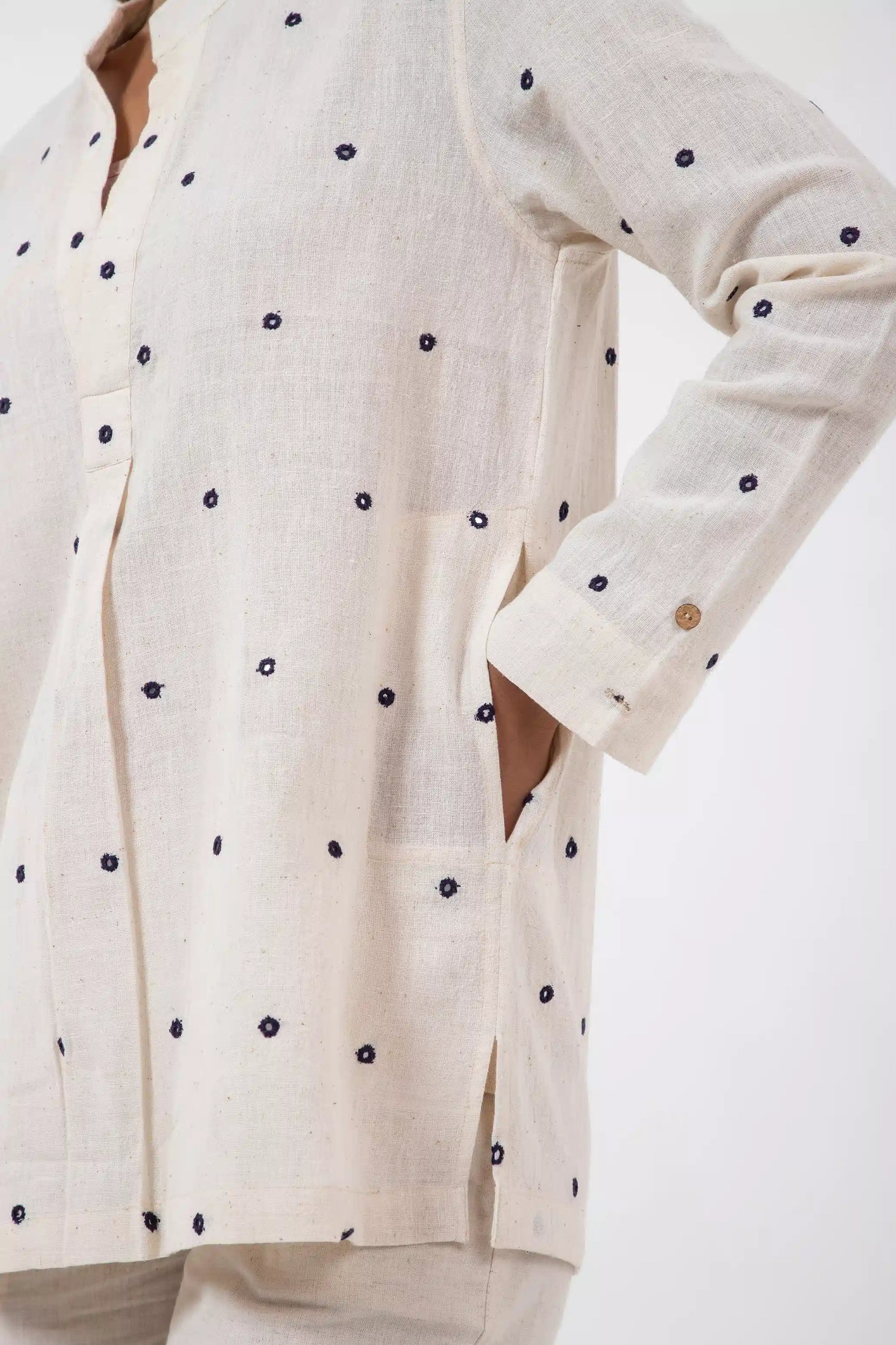 Key Feature: Unisex short kurta with side pockets and reversible 2" cuffs.