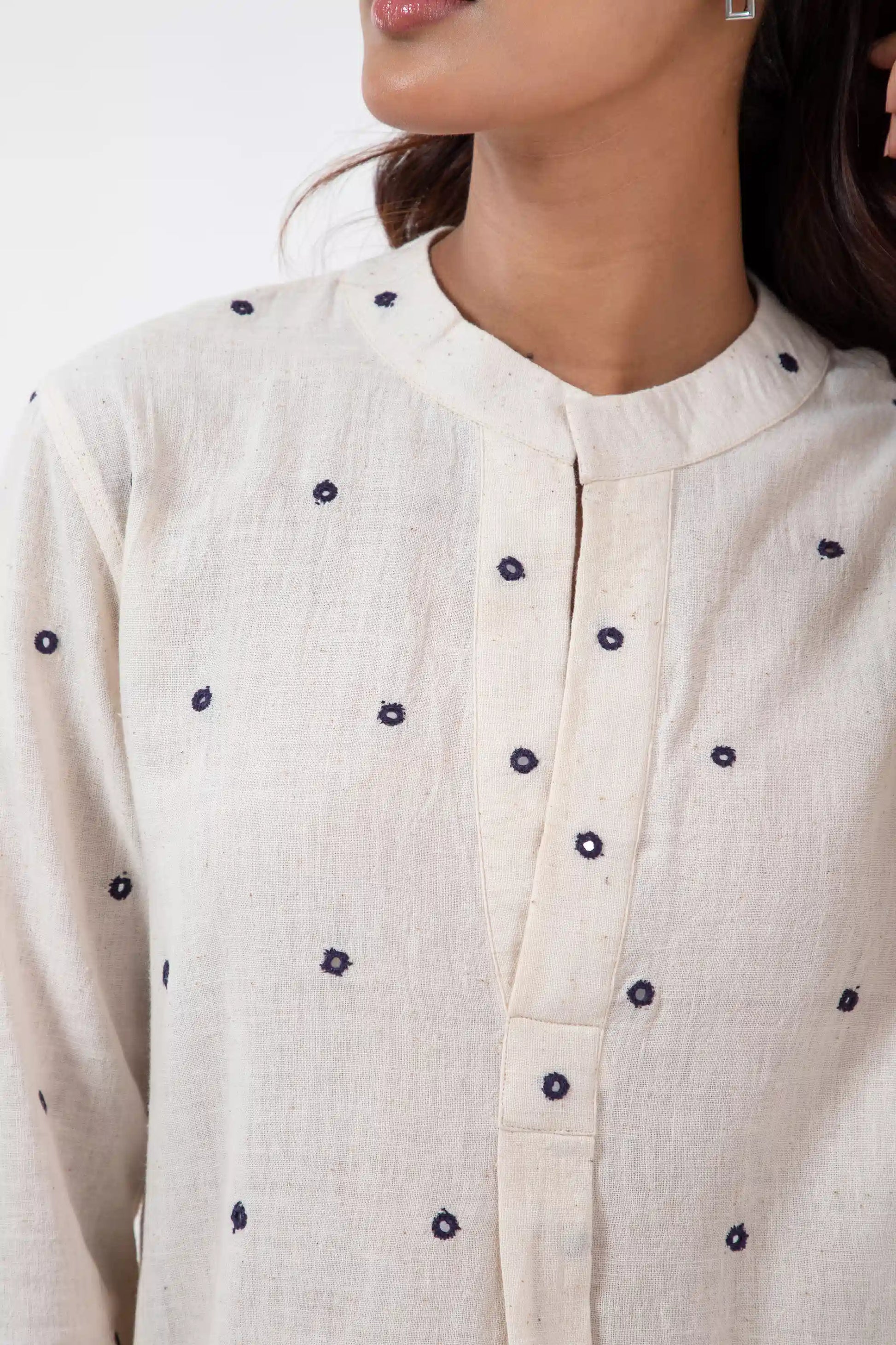 • The mirror work is hand-embroidered by local women artisans in Kutch.