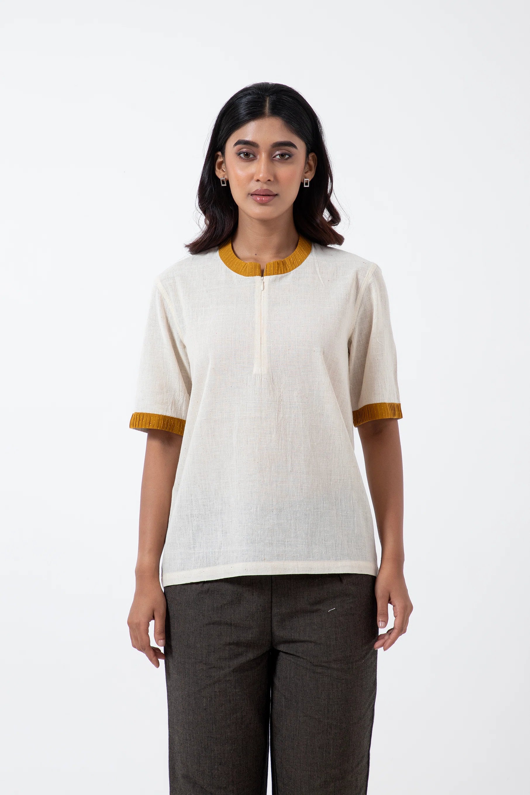 Key Feature: Handwoven boxy t-shirt, featuring pintuck details on the neck and sleeve edges for a ribbed effect.